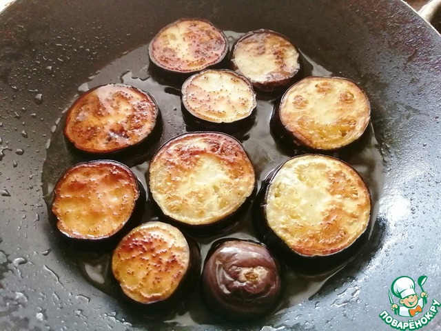 Далее баклажаны можно либо поджарить на гриле (тогда предварительно их нужно сбрызнуть маслом, иначе получатся совершенно сухие и бледные), но мне больше нравится вариант поджаривания баклажан на сковородке в масле. Они получаются румяными, более мягкими и сочным. Если готовите на сковороде в масле, то после этого выложите кружочки на салфетку.