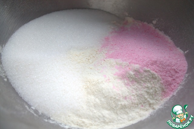 Смешать муку с разрыхлителем, сахаром и сухим ванильным пудингом. Вместо пудинга у меня сухой клубничный кисель-34 г.