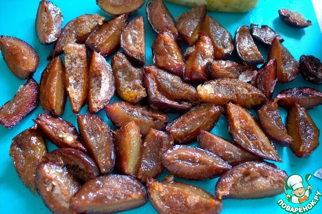 Для начинки у меня была замороженная слива. Разрезать на дольки. Вес примерный, но покрыть надо всю поверхность пирога.