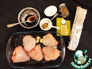 Разморозим бедра курицы и подготовим необходимые ингредиенты