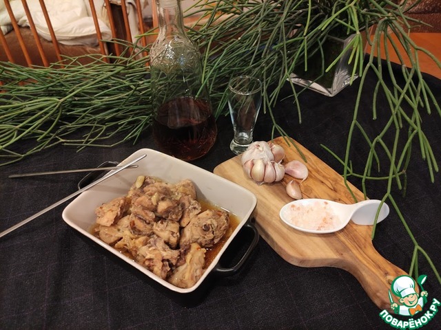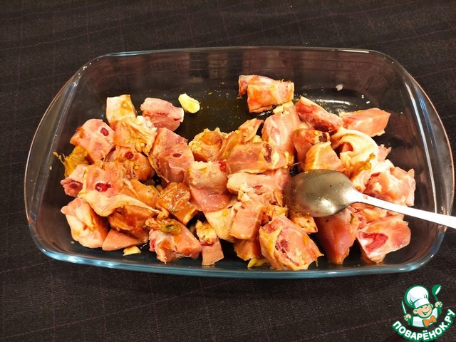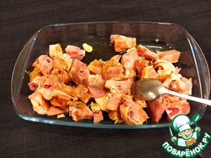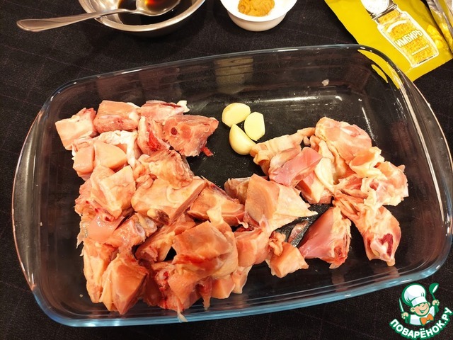 Первым делом нужно нарезать бедра небольшими кусочками, чеснок раздавить поверхностью ножа, добавить в курицу