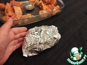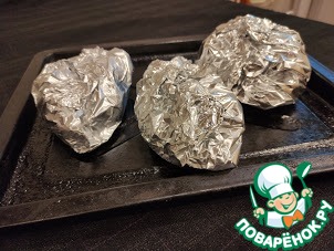 Заворачиваем в 2 слоя фольги, предварительно разделив мясо на 3 части