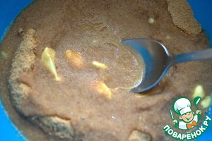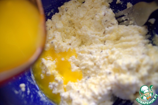 Добавить мягкое или растопленное масло. Перемешать. Если творог слишком влажный, смешайте с ложкой муки.
