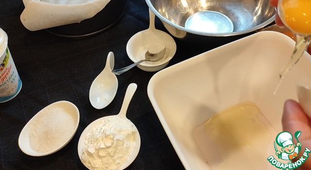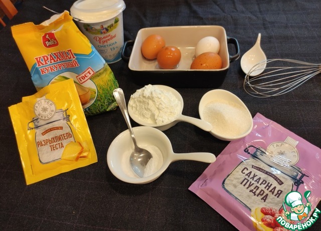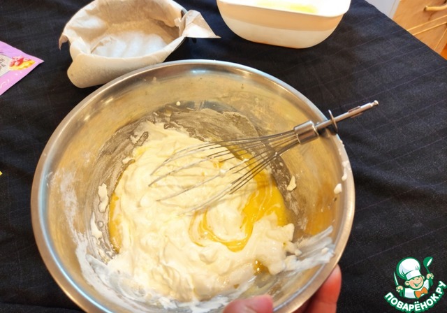 Желтки размешиваем венчиком вручную и добавляем разрыхлитель, сахар, крахмал и сметану, вымешиваем до однородности