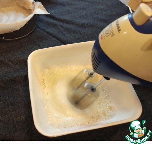 Белки взбиваем миксером с щепоткой соли, на максимальной скорости. До состоянии пены.