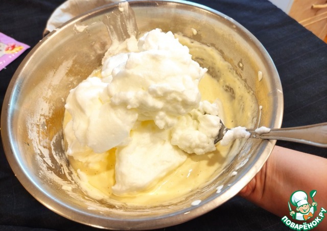 Смешиваем тесто и белки аккуратно ложкой, до однородности
