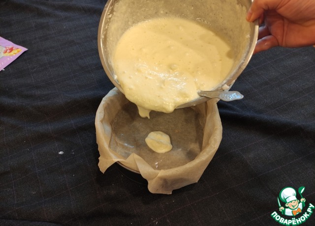 Заливаем в форму 16 см, обернутой бумагой, дно смазала маслом