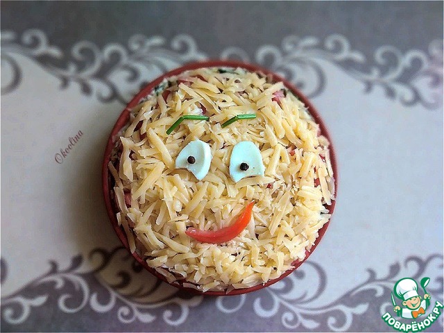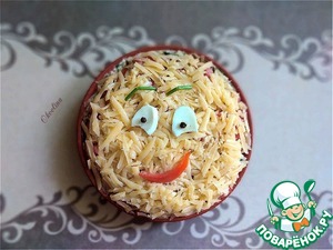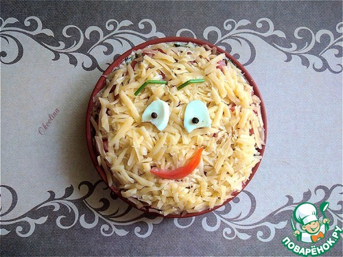 Украшу салат далее. Натёрла Пармезан, присыпала сверху салат и как смогла сделала "рожицу".