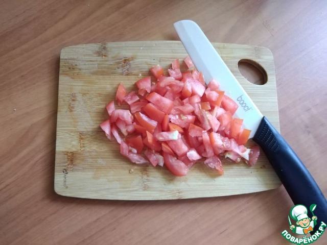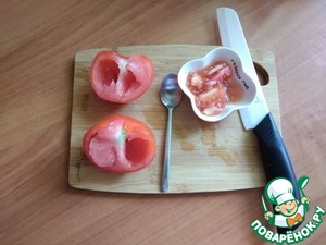 Помидор режем пополам и чайной ложкой выгребаем у него семена и жидкость заодно. Помещаем в блюдце и убираем в холодильник "внутренности" помидора, они могут пригодиться в другом блюде.