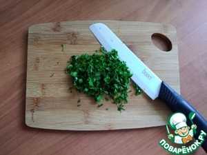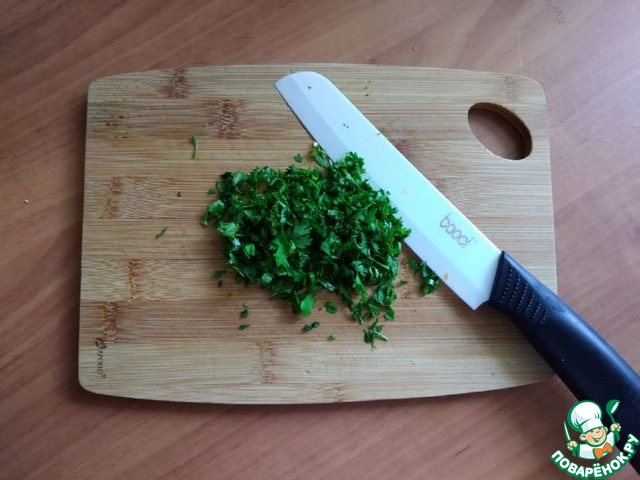 Делаем заправку. Кинзу мелко режем. Кто не любит кинзу, то её можно заменить на петрушку или базилик.