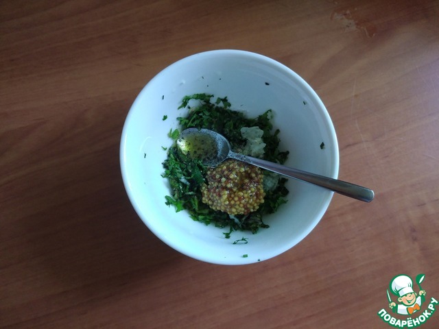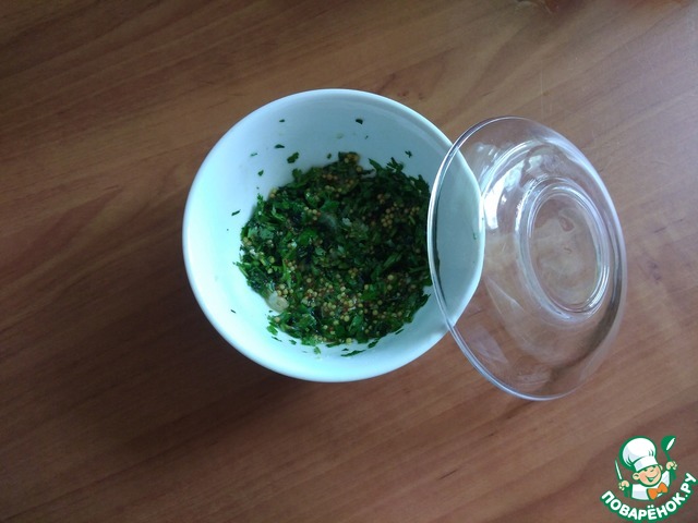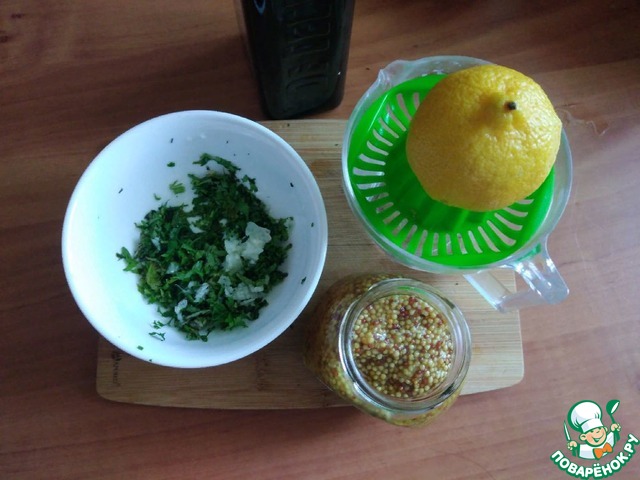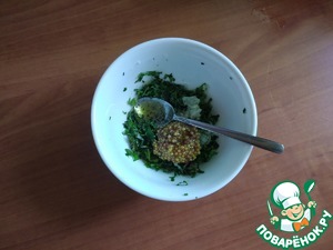 Сок лимонный, масло оливковое, горчицу, соль щепотку и по желанию - перец свежемолотый добавляем к кинзе и всё перемешиваем.