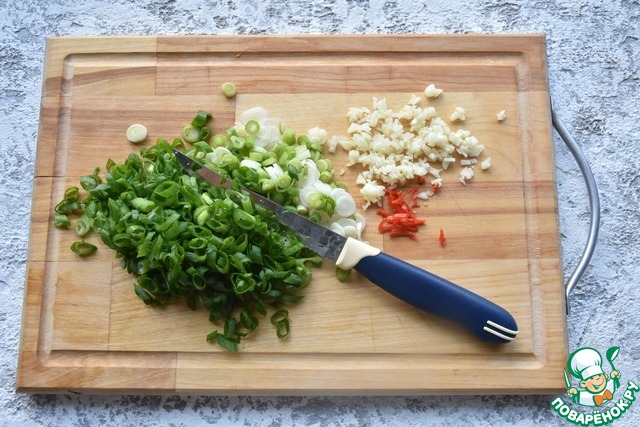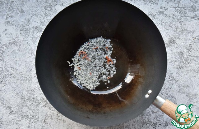 В вок влить 2 ст. л. арахисового масла и на интенсивном огне раскалить его. Выложить измельченный чеснок и острый перец. Обжарить минуту.