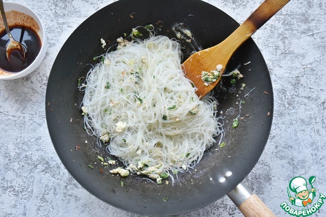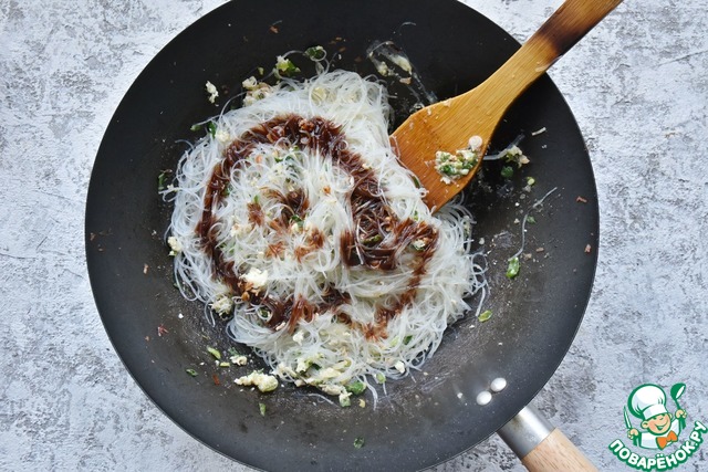 Добавить креветки, соевые проростки, зеленый лук и перемешав блюдо полностью прогреть его. Скорректировать вкус, добавив соевый соус.