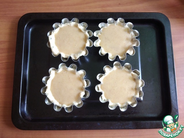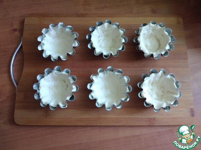 "Растянуть тесто пальцами для придания формы корзиночки. Уложить в формочки аккуратно."