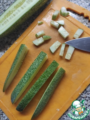 Огурцы хорошо моем, срезаем попки. Нарезаем некрупными кусочками. Примерно как на салат. У меня были крупные огурцы, поэтому резала на 3-4 части. -