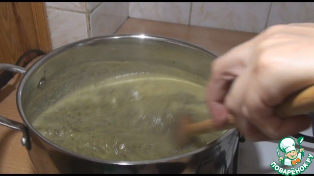 Если вы измельчили, то ставите на небольшой огонь и варим примерно минут 7, помешивая, нам нужно чтобы смесь поменяла цвет с зеленого на янтарный, крыжовник немного проварился и его можно было легко перетереть через сито.