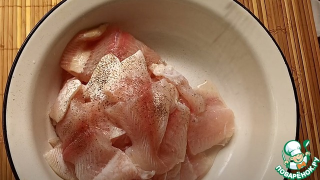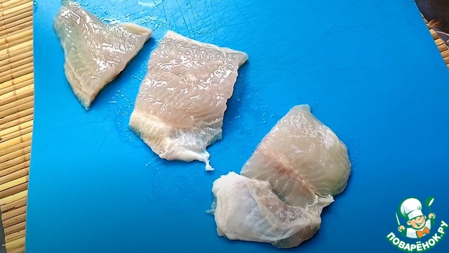 2) Пангисиус промываем, обсушиваем. Затем нарезаем на порционные кусочки, перекладываем в ёмкость.