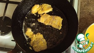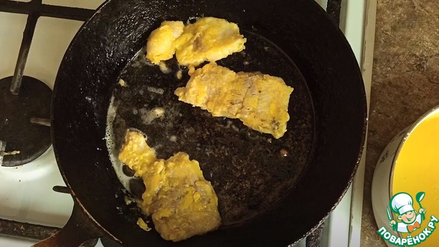 6) Отпускаем порционный кусочек пангасиуса в яйцо, затем в муку, о обжариваем его на разогретой сковороде до корочки. Около 2 минут с каждой стороны!