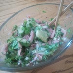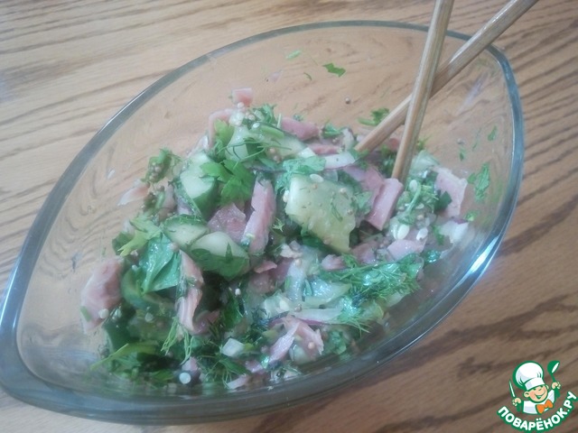 Летний салат на жару! Быстро готовится, легкий. Летом этот салат- частый гость на столе. Повседневный рецепт. Заменяет и мясное блюдо и салат, такой вариант 2 в 1. Отвариваю макаронные изделия и подаю салат. Этого достаточно, чтоб качественно пообедать.