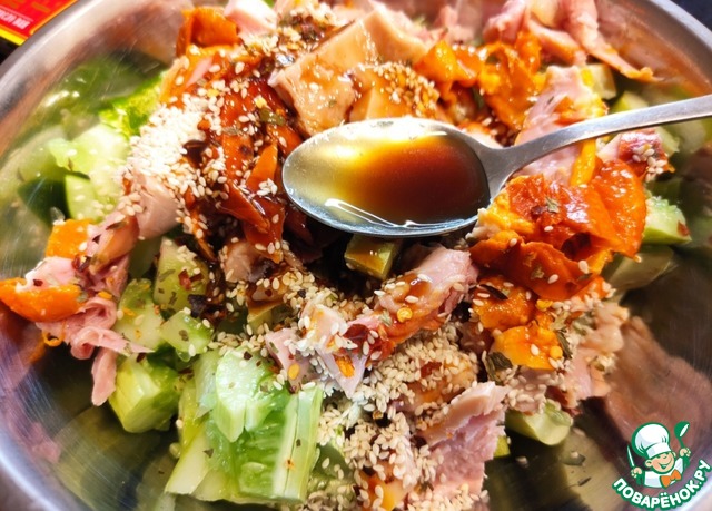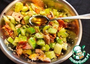 Смешиваем курицу, огурцы, кунжут и соевый соус