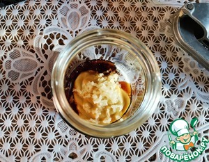Всыпать в сухую чистую баночку соль и свежемолотый чёрный перец (или смесь перцев). Добавить мёд (у меня гречишный), горчицу и измельчённый чеснок. Перемешать.