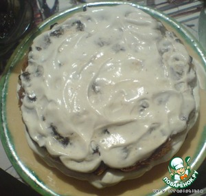 Кладем медовый корж (половину), на него размоченный чернослив (у меня был и так мягкий, а после замачивания его можно было намазывать), пропитываем оставшимся вином и смазываем кремом.
