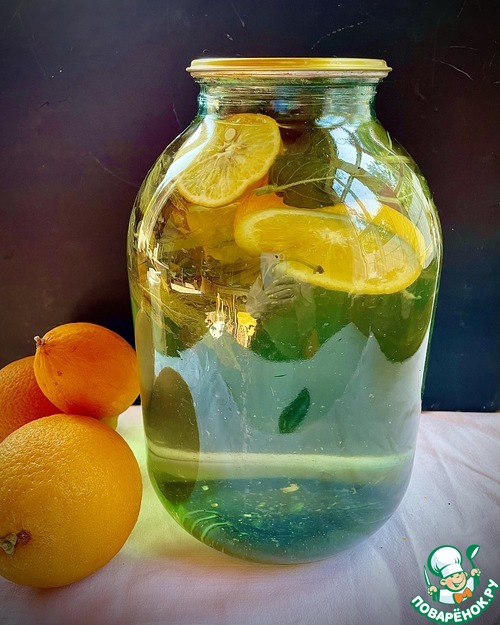 Положила целый апельсин весом 150 грамм и целый лимон - 100 грамм, и увесистый пучок ароматной мяты