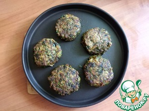 Наливаем масло растительное (у меня подсолнечное рафинированное) на сковороду, греем его. Формируем аккуратные котлетки и сразу выкладываем на сковороду. У меня получилось 5 шт котлет. D-24 см сковороды. Жарим с одной стороны 3 минуты на среднем огне.