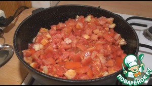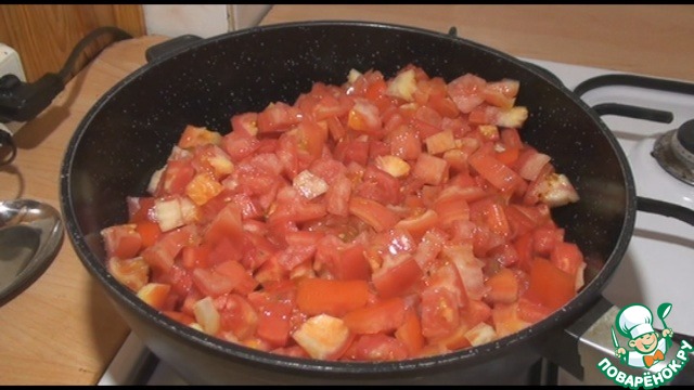 Помидоры помыть, нарезать крупным кубиком, отправить в сотейник или кастрюлю с толстым дном. Накрыть крышкой и тушить на среднем огне 15 минут, чтобы они пустили сок и стали мягкими.
