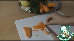 Пока помидоры тушатся подготовим остальные овощи, морковь нарежем кубиком помельче, а кабачок и перец таким же крупным кубиком как помидоры.