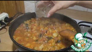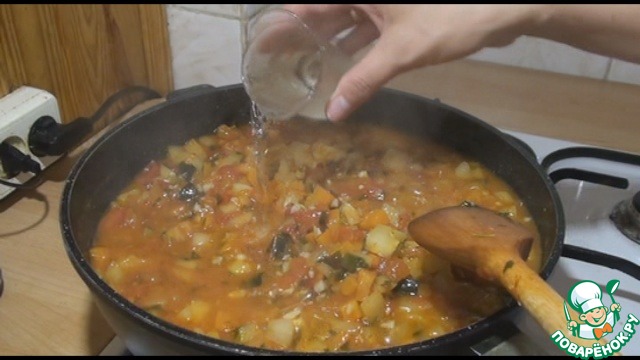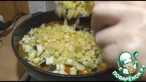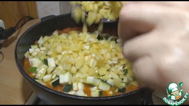 Потом добавляем кабачок и перец, перемешаем и продолжаем тушить под крышкой ещё 20 минут.
