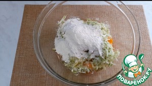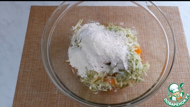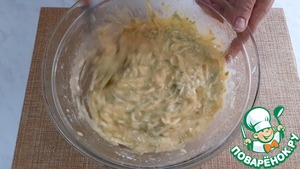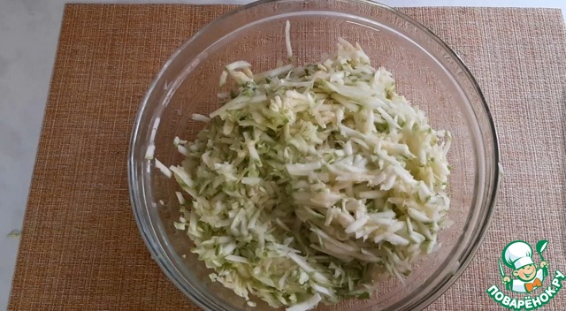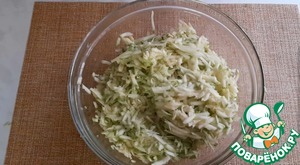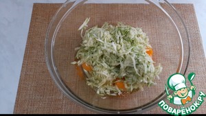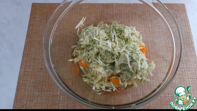 К яйцам добавляем отжатые от жидкости кабачки. Добавляем соль.