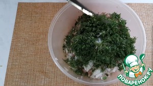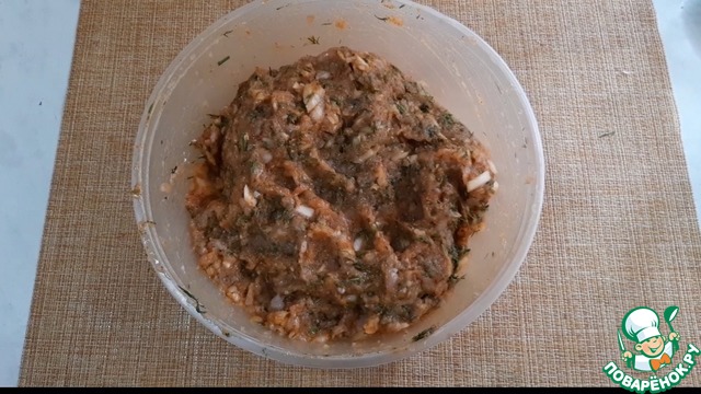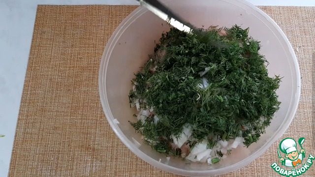 К фаршу добавляем лук, укроп и специи по вкусу. У меня соль, перец и паприка.
