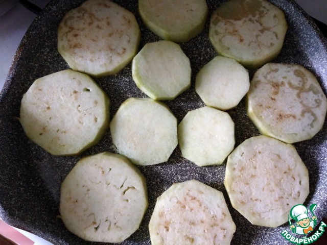 Наливаем масло на сковороду и греем его, выкладываем дольки баклажанов. У меня на сковороду D-24 см уложился весь баклажан. Обжариваем с одной стороны.