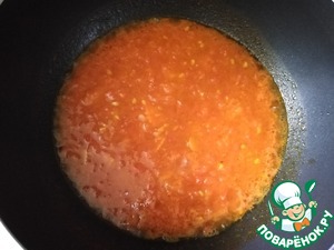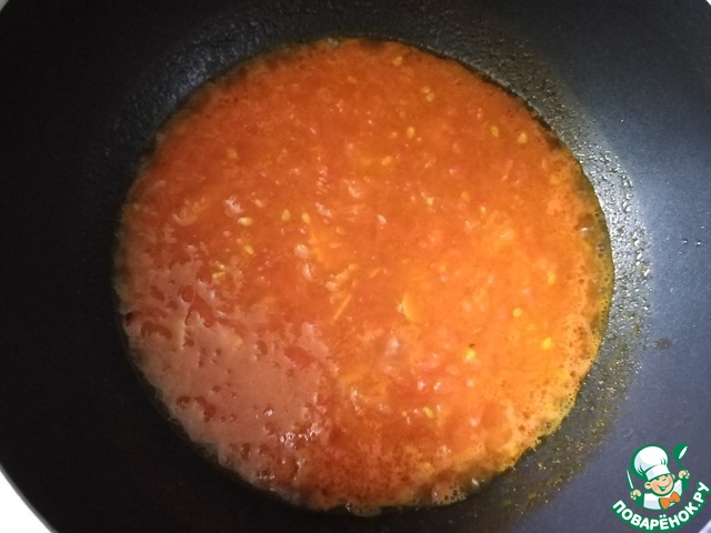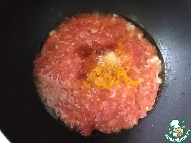 Наливаем воду, выкладываем куркуму, перец кайен, солим по вкусу и доводим до кипения. Варим томатный соус минут 5.