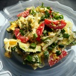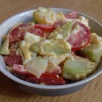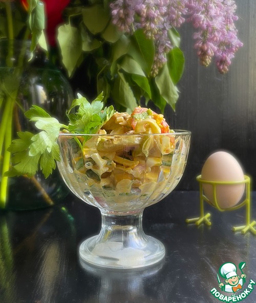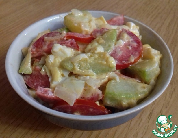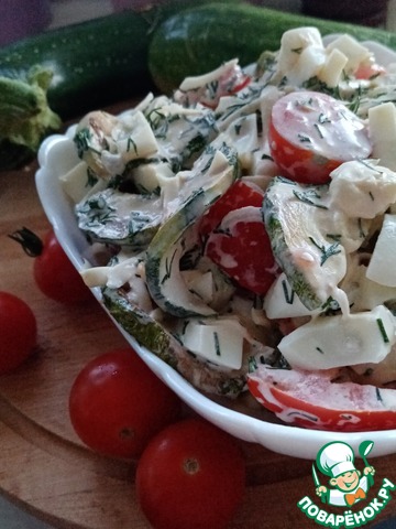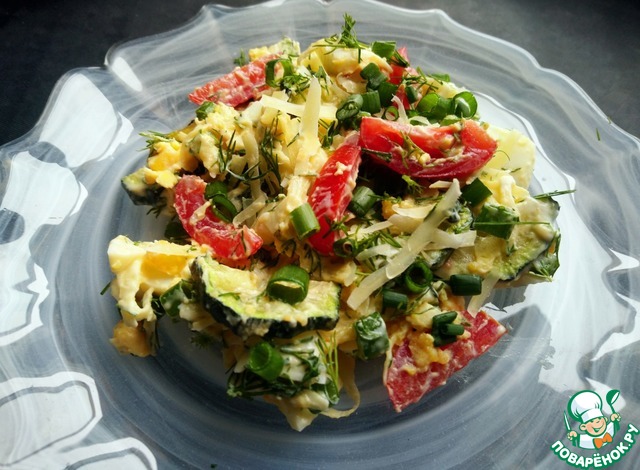 Цукини очистить, нарезать кружочками и обжарить на растительном масле. Тем временем в салатник выложить мелко нашинкованный лук, соль, майонез и сыр натёртый на крупной тёрке. Чеснок пропустить через пресс. Помидор нарезать не крупными дольками, яйца нарезать средним кубиком, добавить остывший цукини. Салат перемешать.