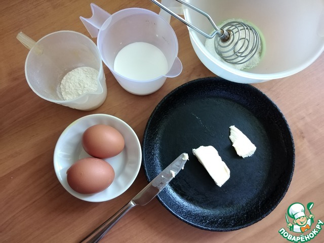 Готовим все ингредиенты. Сковорода у меня старая чугунная D-18 см. Греем духовку до т-220-230 С. Время я выставила 20 минут. 5 минут на разогрев духовки и 15 - на выпечку блина.
