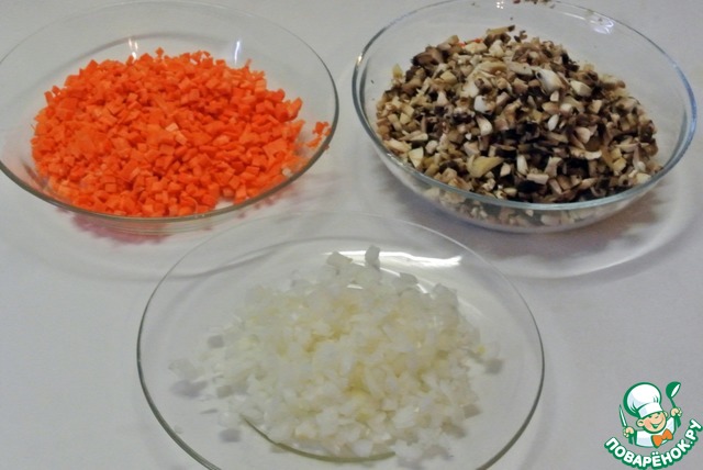 Лук, грибы и очищенную морковь нарезать мелкими кубиками.