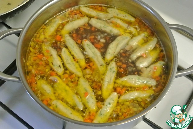 Выложить клёцки в суп, посолить, поперчить. Варить еще 10 минут.