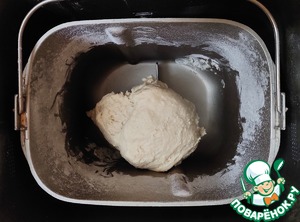 Тесто я буду замешивать в хлебопечке. В ведро хлебопечки налить тёплую воду или молоко, добавить сахар, просеять 350 гр. муки с дрожжами.