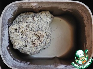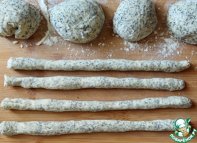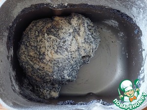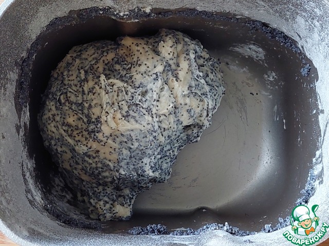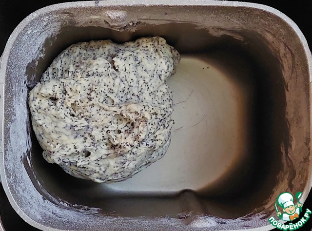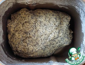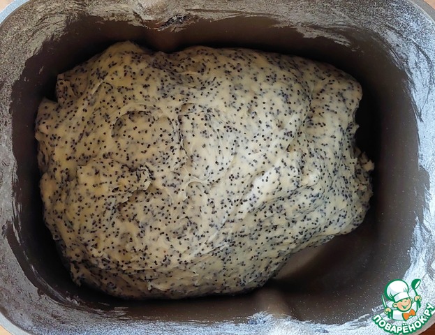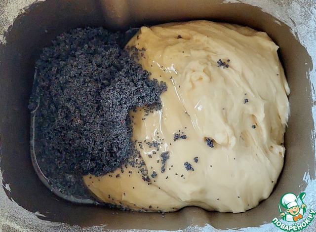 По истечении времени добавить к поднявшемуся тесту растительное масло и мак, с которого предварительно слить всю жидкость.