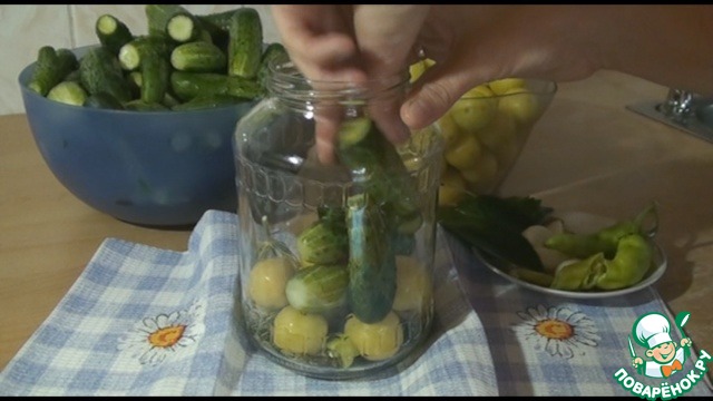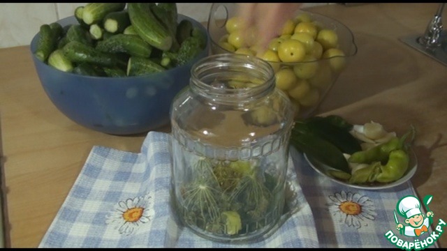 Выкладываем алычу, чтобы закрывала дно. Сверху накладываем огурцы, обрезав кончики.