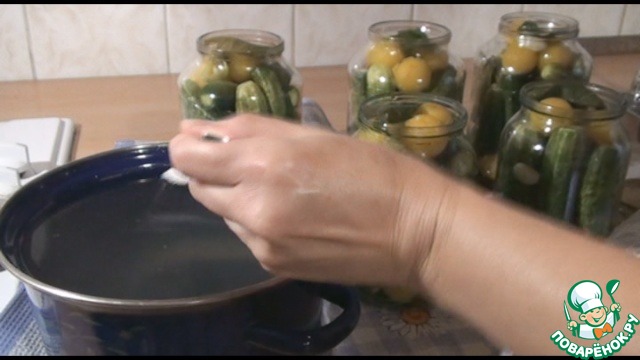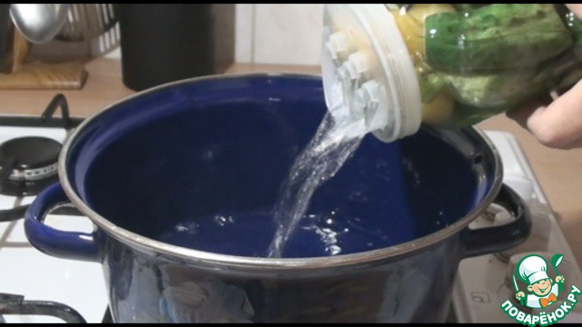 Сливаем воду в кастрюлю, закипятим и опять зальем в банки на 10 минут.