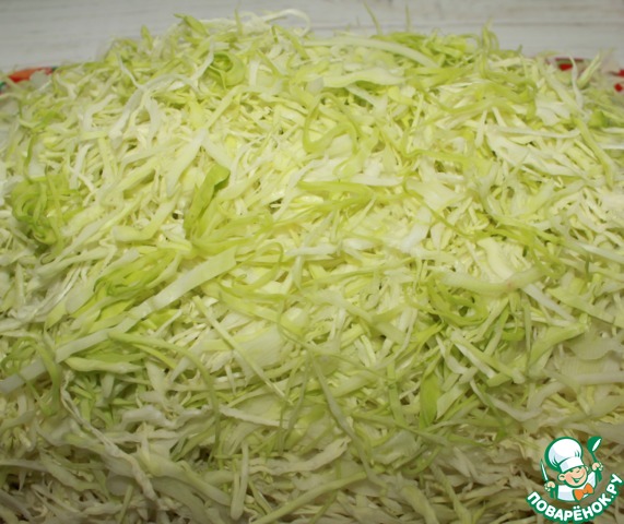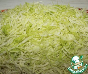 Капусту очистить от верхних и поврежденных листьев, вымыть, нашинковать.