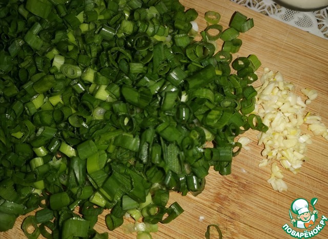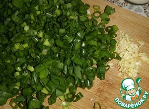 Чеснок мелко порубить, зелёный лук нарезать кольцами.