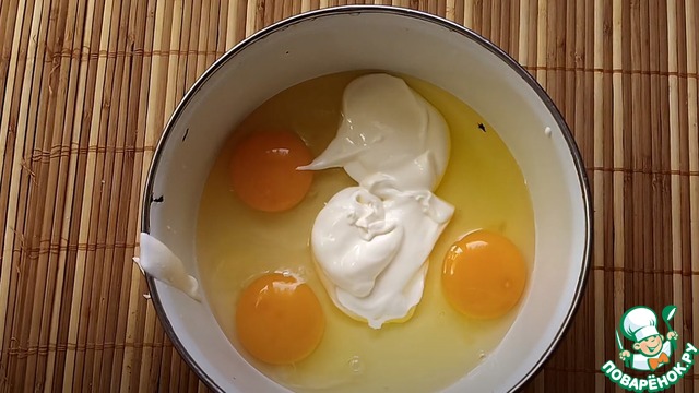 3) В другой миске нужно сделать кляр. В миску вбиваем 3 яйца, и добавляем сметану 3 ст. л хорошо перемешиваем. Затем добавляем муку около 5 ст. л и доводим кляр до густоты.