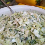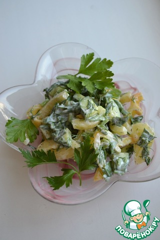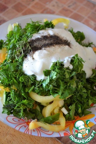 Смешать овощи и зелень. Заправить густым натуральным йогуртом, поперчить и перемешать.