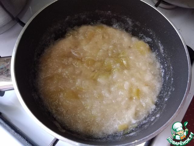 Для начинки можно взять варенье, повидло, джем, сладкий крем. Я сделаю яблочное пюре. Если есть готовое пюре, то используйте его. Яблоки я не чистила, убрала серединку и порезала мелким кубиком. Налила воды в сотейник, выложила яблоки и добавила сахар. Варила до разваривания яблок и выпаривания жидкости. Можно пробить было блендером, но яблоки у меня сами хорошо разварились, я этого делать не стала. Ведь я не заготовку делаю, а на разок.