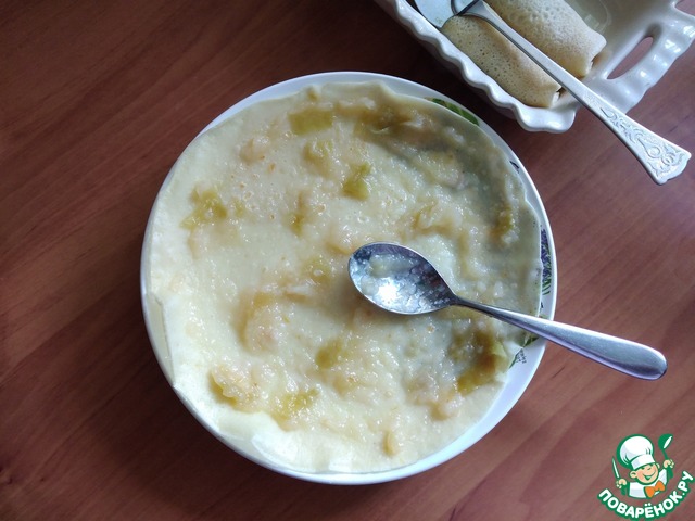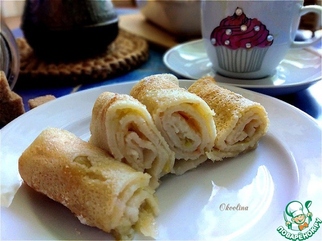 Снимаем на тарелку. Выкладываем на блин 1 ст л пюре яблочного, размазываем его по блину. Подворачиваем немного края блина справа и слева, скручиваем в трубочку. Нам нужна любая форма или противень небольшой, где будем далее запекать блины. У меня форма шириной-15 см и длиной-20 см. Обмазываем её маслом и выкладываем блинные трубочки в форму. У меня уместилось 4 шт. Из теста я выпекла 6 шт блинов тонких D-24 см. Количества пюре хватило ровно на 6 блинов.