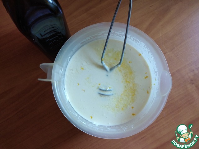 Замешиваем тесто. Разбиваем яйцо, венчиком соединяем. Выкладываем муку с солью. Тщательно размешиваем, чтобы не было комочков. Добавляем бренди (коньяк), лимонный сок и цедру.
